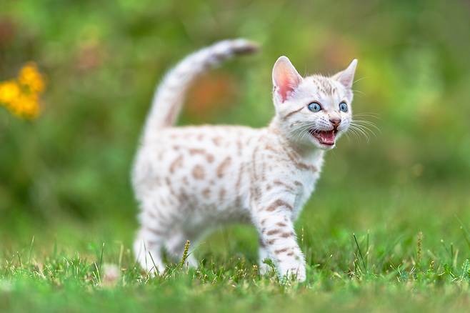 이때, 갈색 털이 나는 유전자를 억제해 흰 털인 뱅갈 고양이는 실버 뱅갈로 불립니다. 실버 뱅갈은 이름에서 알 수 있듯 털이 하얗지만, 은은하게 회색빛이 돈다고 합니다.