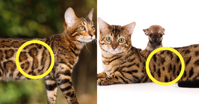 뱅갈 고양이의 무늬는 크게 스팟(spotted)과 마블(marbled) 두 가지로 나눌 수 있어요. 이때, 일반 점박이와 다르게 반점 같은 형태의 무늬도 있는데, 그걸 로젯(rosett)이라고 부릅니다.