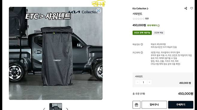 더 넓은 범위를 커버하는 270° 어닝은 115만 원으로, 여름철 강한 햇빛을 피할 수 있는 넓은 그늘을 제공한다.