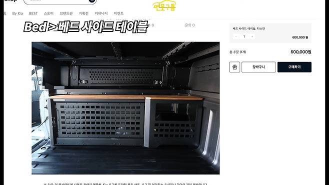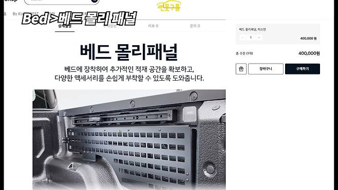 베드 몰리 패널은 소화기, 삽, 전동 공구 등을 장착할 수 있어 실용성을 높였다. 좌우 설치가 가능하며 좌측 패널에는 콘센트가 포함되어 전자기기 사용이 용이하다. 가격은 40만 원으로, 아웃도어 활동 시 필요한 장비를 체계적으로 정리할 수 있다.