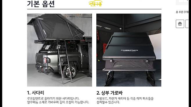 루프탑 텐트는 320만 원으로 가격이 다소 높지만, 캠핑의 편의성을 크게 높여주는 장점이 있다. 텐트는 루프에 장착되어 365일 보관함 역할도 겸할 수 있으며, 지상에서 떨어진 공간에서 안전하게 숙박할 수 있는 장점이 있다.