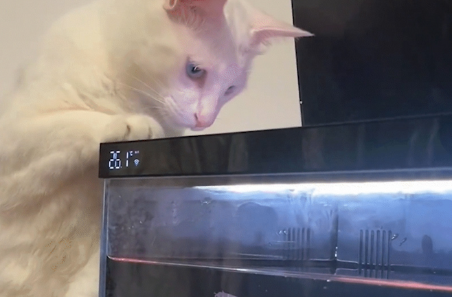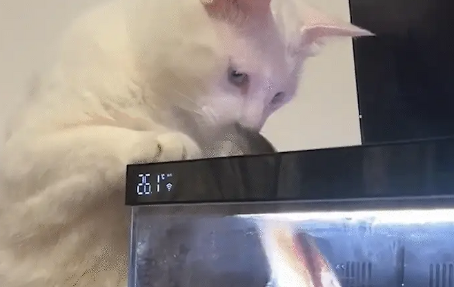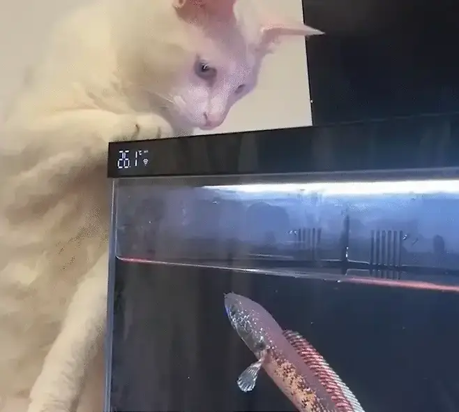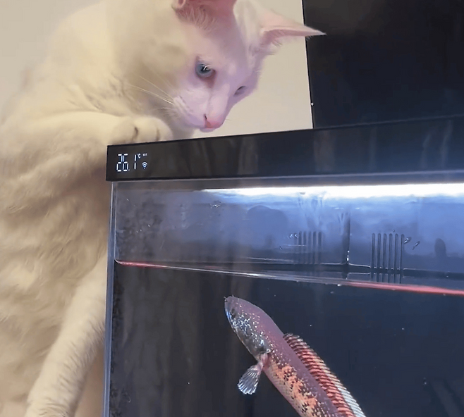 그날 집의 장난기 많은 고양이가 참지 못하고 가볍게 어항으로 다가갔습니다. 어항 위에 엎드려 호기심 가득한 눈으로 뇌룡어를 바라보았죠. 그런데 놀랍게도 뇌룡어 역시 지지 않고 큰 눈을 동그랗게 뜨고 고양이와 맞서며 응시했습니다!