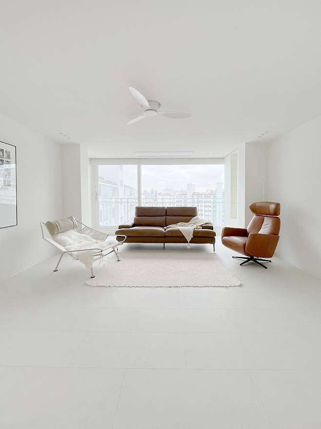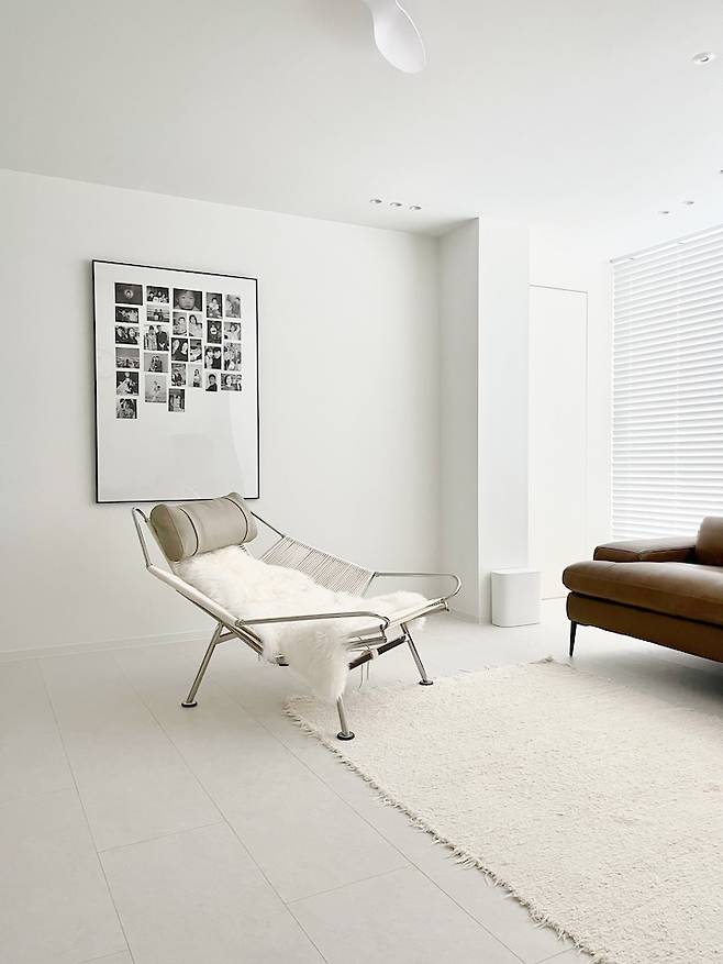 맥시멀리스트이지만 미니멀리스트로 전향 중이기 때문에 거실엔 소파와 디자인 체어 이외에 다른 가구나 소품을 놓지 않고 있어요. 거실이 휑한 듯 비어져 있는 느낌이다 보니 소파나 디자인 체어를 어떤 위치에 배치해 놓아도 이질감이 없더라구요.