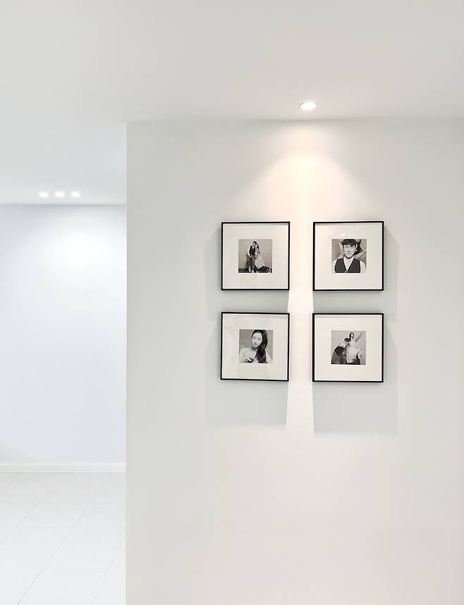 이렇게 공사를 해놓으니 현관문을 열면 마주하는 벽에는 리스트리를 달아놓을 수 있고 거실에서 보이는 가벽에는 액자를 걸어 갤리러 같은 연출이 가능해져서 집안의 분위기를 잡아주는 공간이 되었습니다.