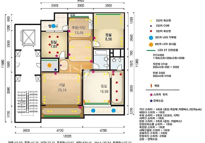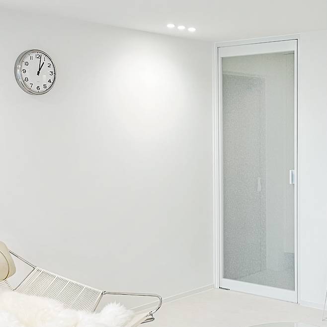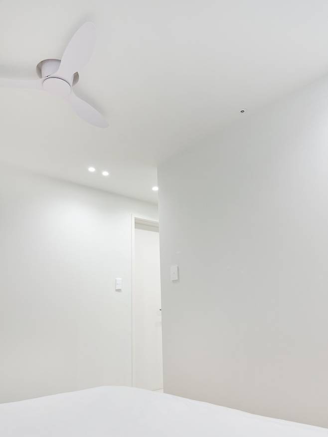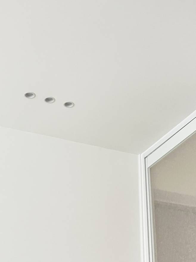 조명은 모두 2인치 확산형 다운라이트를 설치했어요. 거실 가운데 실링팬이 있다 보니 다운라이트만으로 조도가 충분하지 않을거 같아서 커튼 박스에 간접조명을 설치했더니 딱 알맞게 조도가 맞춰졌어요.
