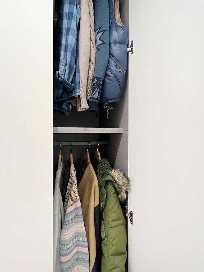 가벽 안쪽으로는 붙박이장과 수납장을 제작해서 오로지 옷만을 위한 공간을 만들었어요. 배우자와 함께 미니 드레스룸을 이용하기에는 공간이 좁아서 혼자 이용해야 하지만 넉넉한 수납을 좋아하는 터라 양쪽 수납을 포기할 수 없더라구요.