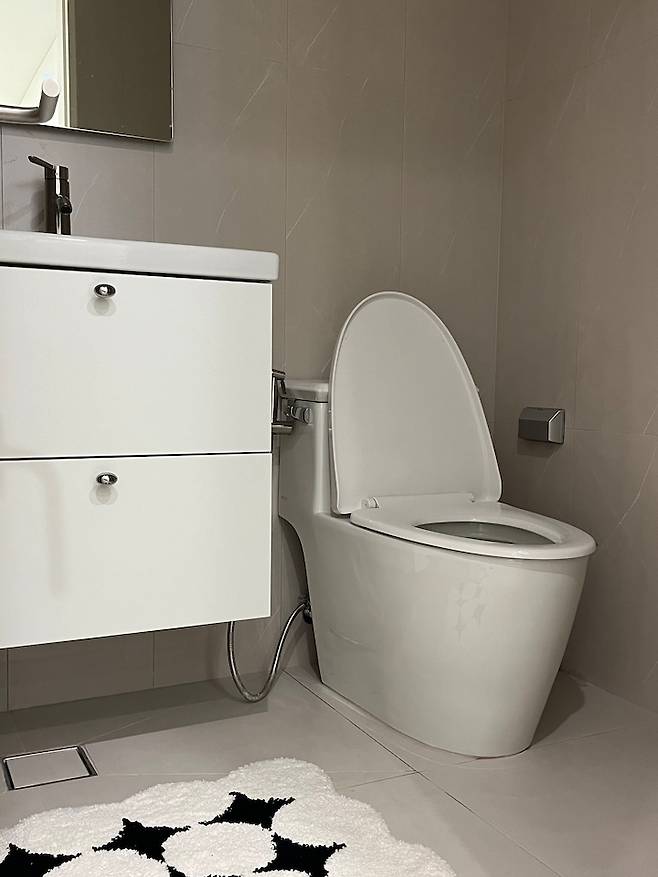 물 내림 레버 없는 버튼식이라 편하고 수압에 관계없이 물도 잘 내려가지만, 탱크없이 변기 내부 센서의 압력으로 내려가는 방식이라 변기를 내리면 변기 위로 물이 많이 튀더라고요. 디자인적으로 미니멀해서 그 부분으로 만족감을 가지고 있지만 다시 설치한다면 탱크가 작은 치마형 변기를 선택할 거 같아요.