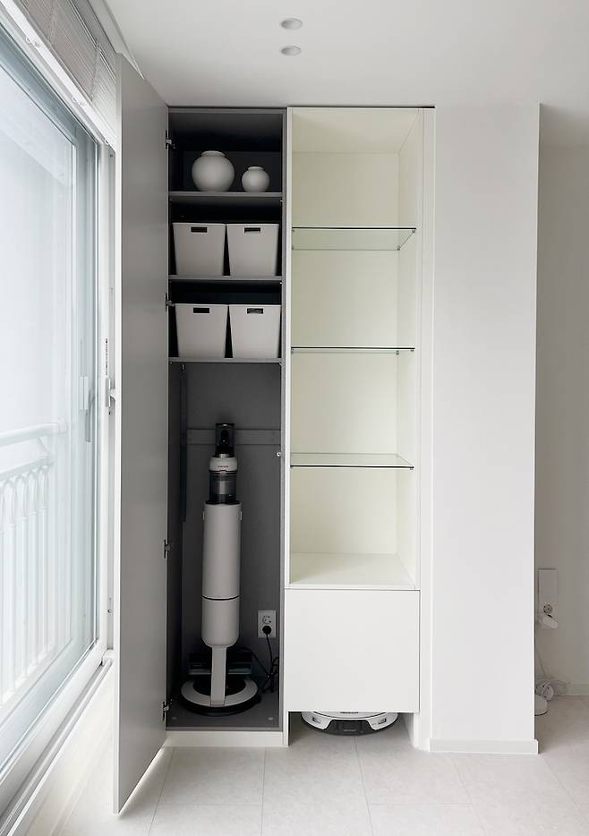 확장 후 철거가 불가능한 내력벽엔 수납장을 제작했어요. 오늘의집에서 내력벽 수납장 활용 노하우를 공유해주신 덕에 수납장 안쪽엔 콘센트를 개설해서 청소기와 로봇 청소기를 보관하고 있어요. 로봇 이모님 출퇴근 편하시라고 출입구도 만들어 드렸더니 청소가 편해졌습니다.