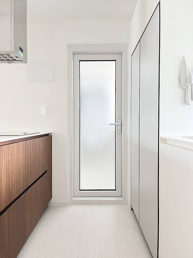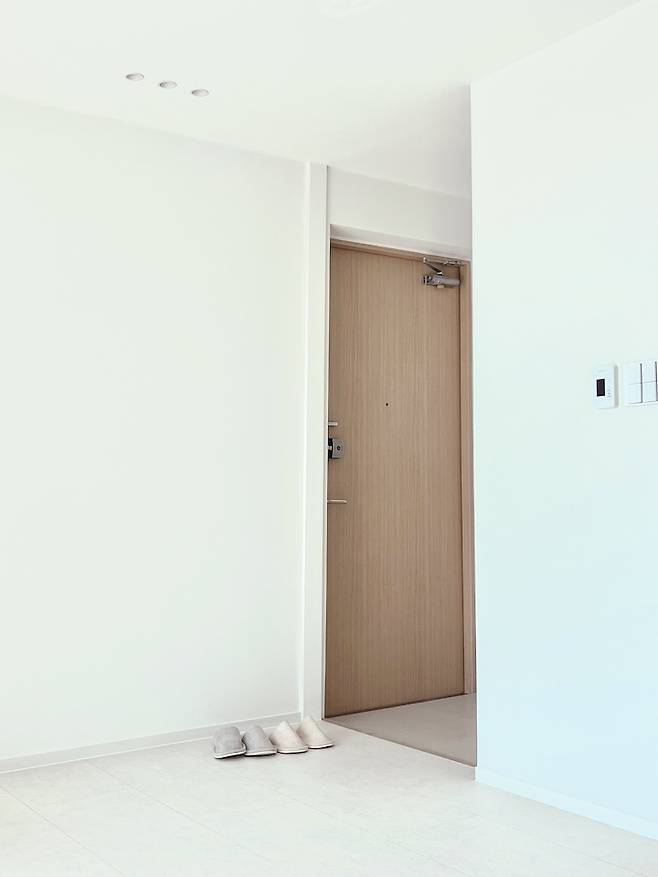현관은 한정적인 공간이기 때문에 여닫는 폭이 넓어야 하는 슬라이딩 도어는 시공이 불가했고 3연동 도어는 심미성이 떨어져서 가장 심플한 여닫이 도어를 시공했어요.