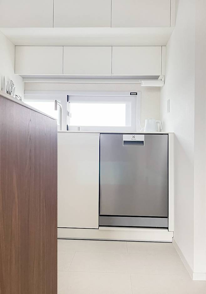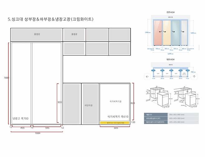 투베이 주방은 좁기 때문에 어쩔 수 없이 냉장고를 다용도실에 놓거나 벽면에 세로로 놓고 사용하기도 하는데요. 저는 편리한 동선을 위해 냉장고는 꼭 주방에 놓고 싶어서 냉장고장을 주방 창문 쪽에 배치했고 그 옆으로는 개수대와 식기세척기를 설치했어요.