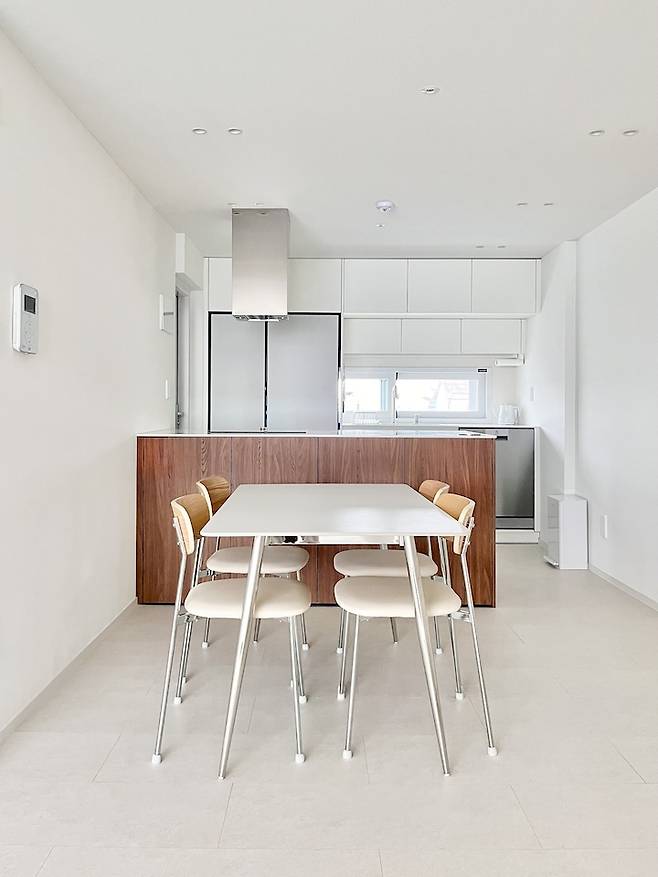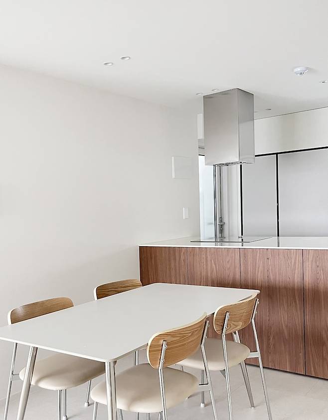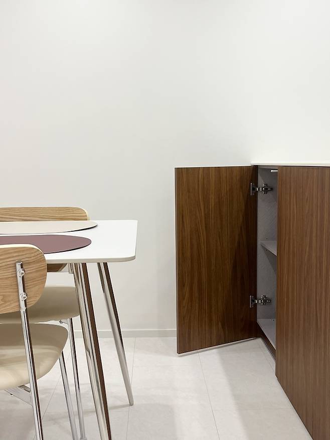 주방 또한 다이닝 공간의 역할 뿐만 아니라 오랜 시간 앉아서 수다를 떠는 공간이기에 푹신하고 질리지 않는 디자인의 의자를 선택했어요. 오크 컬러 우드 식탁을 써보니 관리가 힘들었던 경험이 있어서 관리가 편한 세라믹 식탁을 선택했는데 김치나 양념 얼룩이 잘 지워지고 튼튼해서 만족스럽습니다.