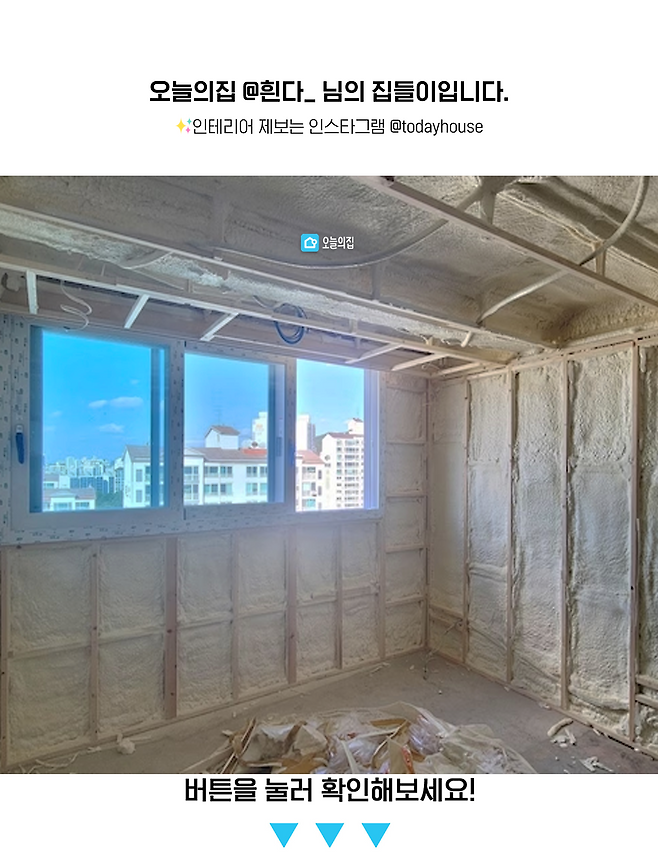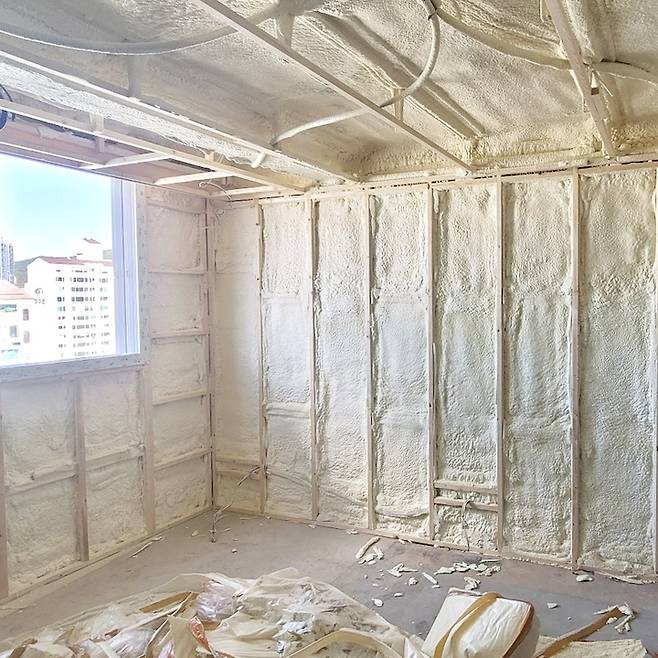 저희 집 인테리어 공정 중 특이점으로는 최상층 끝집이라 단열공사를 해야한다는 점이었어요. 위, 아래, 옆집이 있다면 단열에 도움이 될텐데, 바로 외벽이다 보니 집 전체 단열을 해야 했어요 .단열 소재 이보드 단열과 폼단열 중 고민 끝에 우레탄 폼으로 집 전체를 단열했습니다.