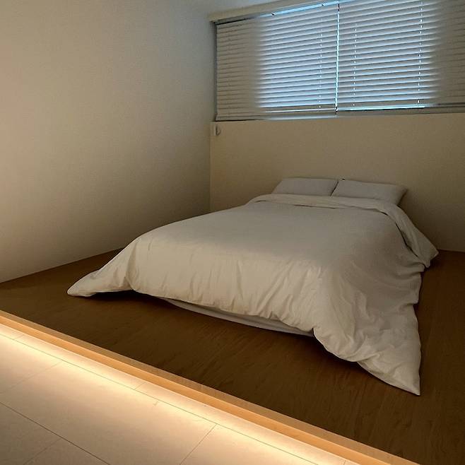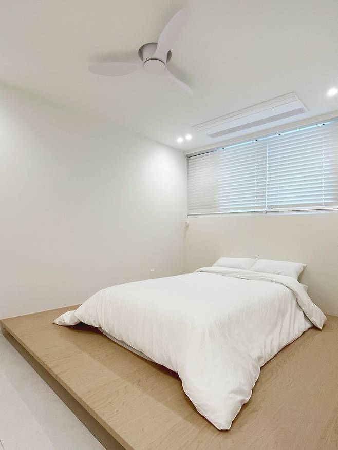 안방은 공간분할을 통해서 휴식을 실현할 수 있는 공간으로 만들었어요. 침대에 누워서 쉬고, 평상에 앉아 간식을 먹으며 쉬고, 작은 침실이지만 휴식 집약적인 공간이 되었어요.