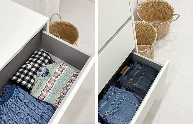 옷장은 붙박이장과 서랍장으로 제작했어요. 서랍장은 총 12칸으로 제 옷 6칸과 배우자 옷 6칸으로 나누어 사용 중이에요. 서랍엔 속옷, 티셔츠, 니트, 데님, 스커트를 보관하고 있는데 6칸에 꼭 맞게 들어가네요 : )