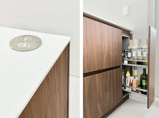 아일랜드에는 소형 주방가전을 사용할 때 편리한 매립형 콘센트를 설치했고 양념장 레일과 밥솥 레일을 구성해 제작했어요.