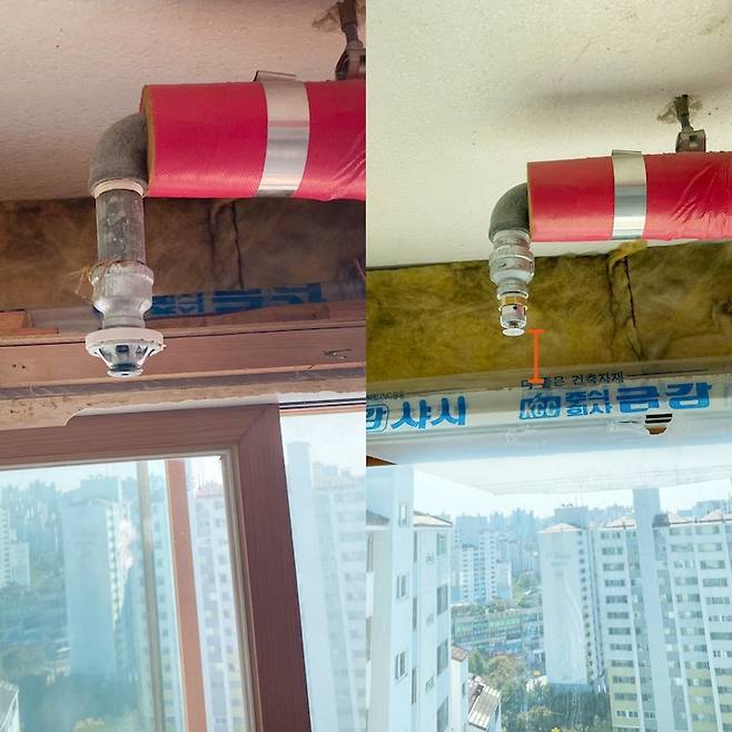 스프링쿨러는 소방시설이기 때문에 일반 설비업자 분이 공사할 수 있는 부분이 아니라고 하더라고요. 그래서 소방 전문 자격증이 있는 소방업체에 스프링쿨러 길이 컷팅을 요청했고, 최대한으로 컷팅하니 3-4cm 정도가 잘라졌습니다. 천장을 많이 높이고 싶었는데 스프링쿨러로 인해 예전보다 3-4cm 정도만 높일 수 있었어요.
