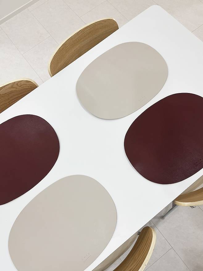 때에 따라 식탁 위치를 바꿔가며 구조를 바꿀 계획이라 다이닝 공간 천장엔 따로 조명을 설치하지 않았어요. 식탁 위에 음식과 식기가 꽉 채워지면 근사해 보이지만, 종종 식탁이 조금 심심해 보일 때는 테이블 매트로 포인트를 주고 있습니다.
