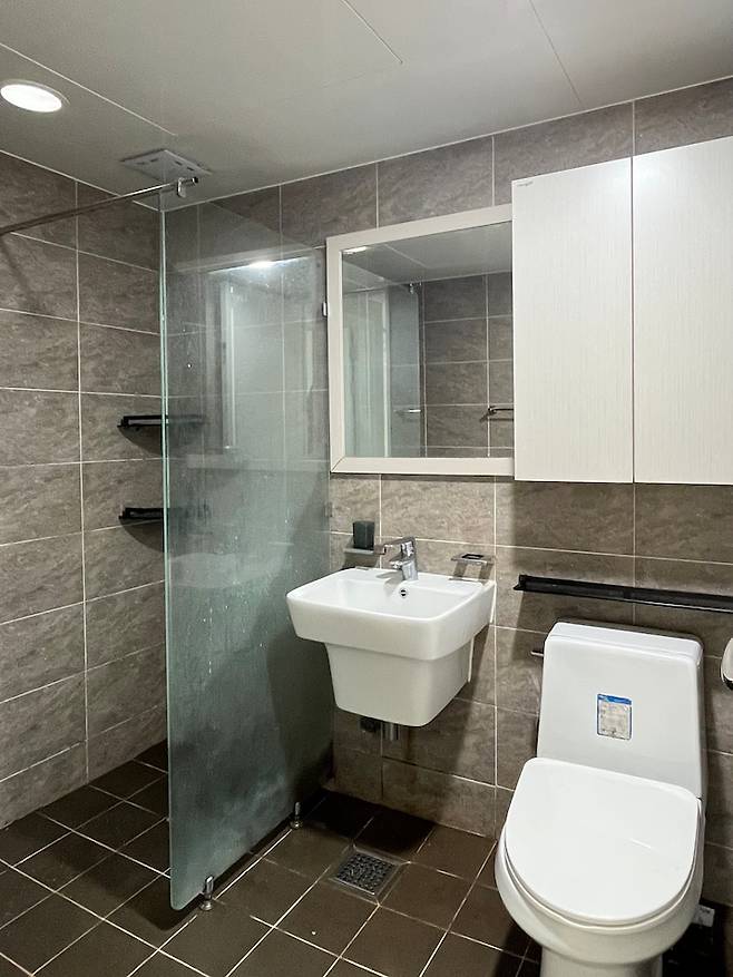 베이지 컬러의 약간의 재질감이 있는 600각 포세린 타일을 선택했고, 욕조를 잘 쓰지 않기에 샤워 부스를 설치해서 건식 욕실로 사용하고 있습니다.