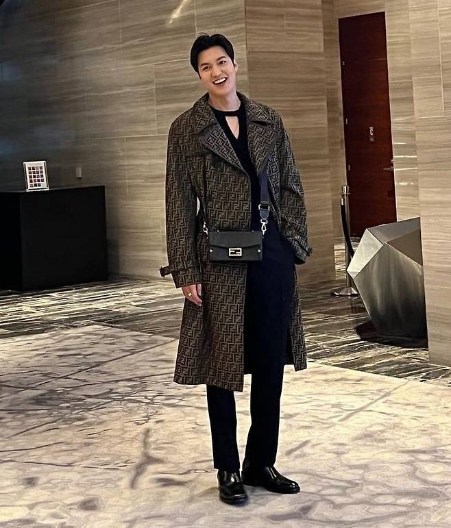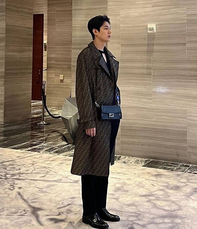 이민호는 FF 패턴의 오버사이즈의 트렌치 코트와 남성 블랙 바케트 트렁크 백을 크로스 매치하며 스타일리시한 코트룩을 연출했다.