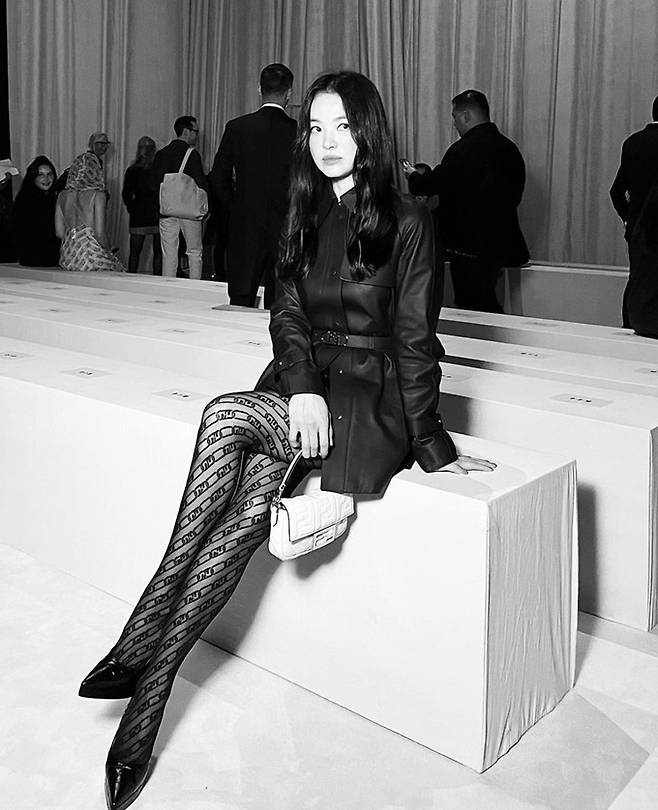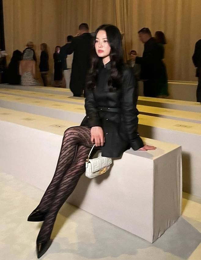 이날 송혜교는 매트한 블랙 벨티드 재킷으로 매혹적인 하의실종룩을 연출했다. 여기에 펜디 자카드 패턴의 스타킹과 아이코닉한 바게트백으로 스타일 엣지를 더했다.