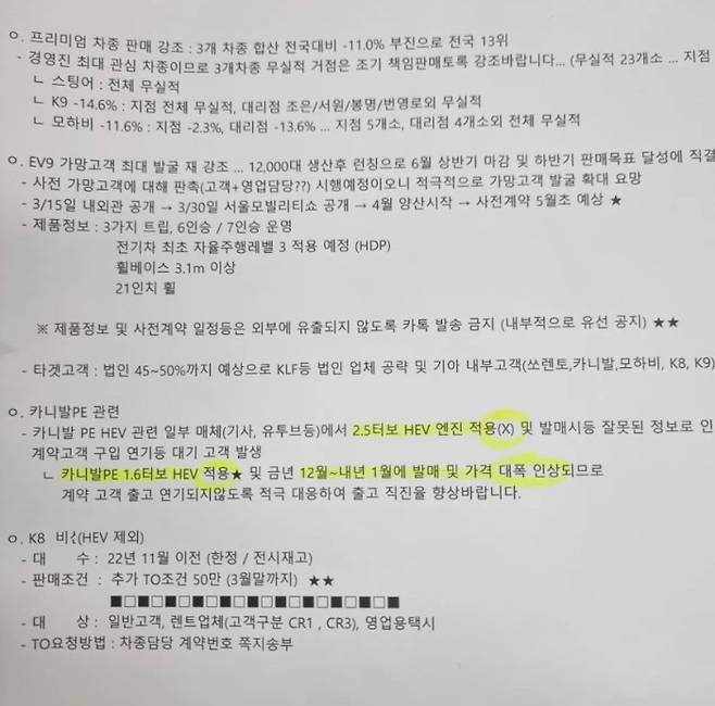 이외에 내부 문서에는 경영진의 최대 관심 차종인 프리미엄 3개 차종 스팅어, K9, 모하비의 판매를 독려하고, EV9 가망 고객을 최대한 발굴하라는 문구도 보인다.