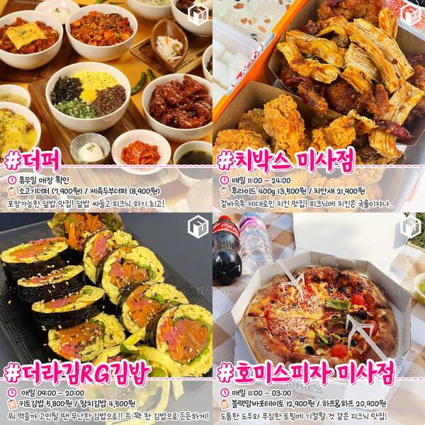 피크닉에 빠질 수 없는 치킨은 치박스 미사점을 추천하는데요. 400g의 후라이드가 13,500원에 판매되고 있어 부담없는 가격으로 치킨과 피크닉을 즐길 수 있습니다. 언제 먹어도 좋은 김밥은 더라김RG 김밥을 추천하는데요. 키토김밥이 5,800원으로 가벼운 피크닉 음식으로 좋습니다.