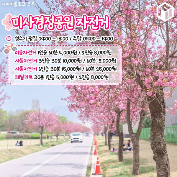 하남 미사경정공원은 봄철 벚꽃과 겹벚꽃 명소로도 잘 알려져있습니다. 벚꽃 및 겹벚꽃 시기인 2024년 4월 5일부터 5월 6일까지 공원 내 차없는 거리를 운영하고 있는데요. 차량 통행의 위험 없이 길게 늘어선 겹벚꽃길을 산책하거나 자전거를 타고 달리는 등 한가로운 시간을 보낼 수 있습니다.