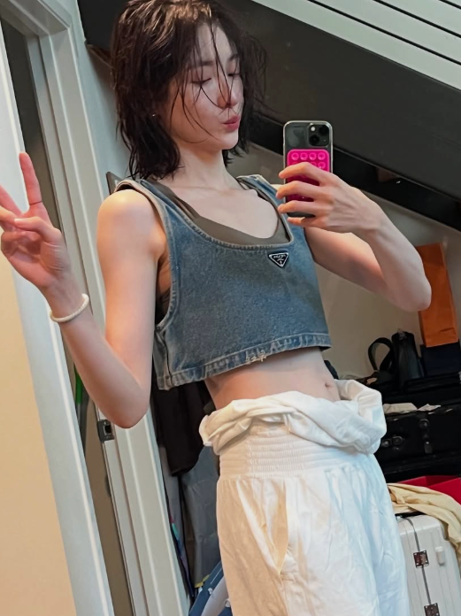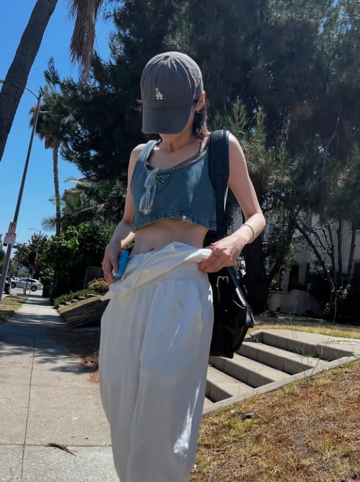상의는 크롭된 데님 브라탑으로, 짧은 기장과 넓은 어깨끈이 활동성을 높이며 여름철 가볍고 경쾌한 인상을 준다.