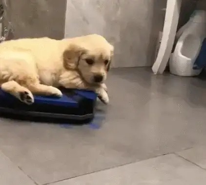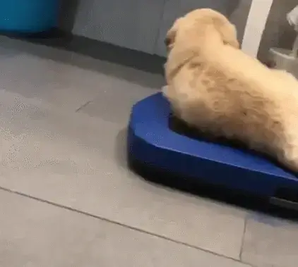 로봇 청소기를 '라이더'로 삼고 싶어 하는 아기 골든 리트리버의 흥미로운 모습이 포착되었습니다!
