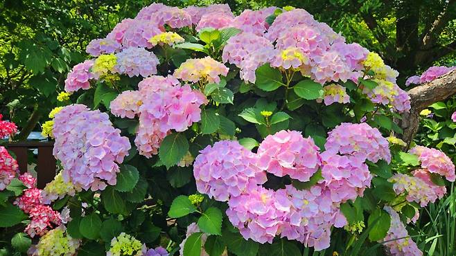 흰색, 연분홍, 보랏빛 등 다양한 색감의 수국이 언덕과 길모퉁이마다 수채화처럼 펼쳐져, 걷는 길 자체가 하나의 작품이 된다. 특히 평상과 벤치가 곳곳에 놓여 있어, 그늘 아래 앉아 수국을 바라보며 보내는 여유로운 시간은 그 어떤 카페보다 아늑하다.