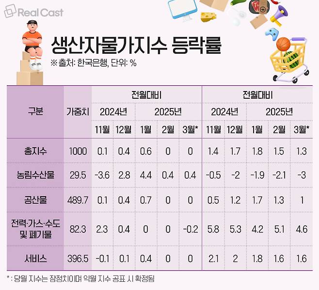 생산자물가지수는 지난해 11월(+0.1%) 상승 반전한 이후 12월 (+0.4%)과 올해 1월(+0.6%), 2월(+0.0%) 4달 연속 오름세를 이어가다 3월들어 멈췄습니다.