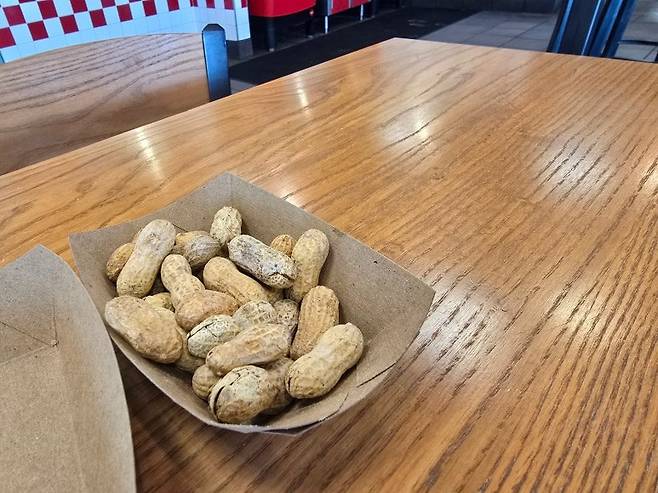햄버거 기다리는 동안 무한리필로 제공되는 땅콩 먹으며 기다리기. 소금물에 삶았는지 짭쪼롬한게 은근 자꾸 까먹게 되는 중독성이 있다.