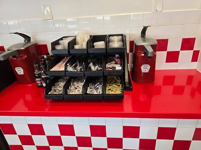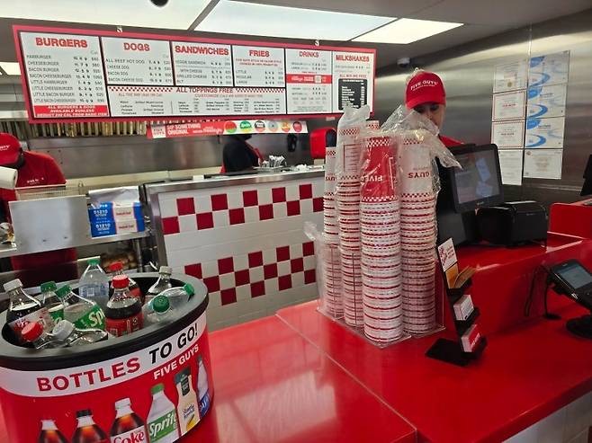 단조로와 보였던 외관과는 달리 입장하자마자 열정적인 붉은색과 흰색의 반전이 펼쳐진다. 그렇게 파이브 가이즈는 미국스럽고 투박한 듯하면서 강렬한 첫인상으로 우리를 반겨주었다.