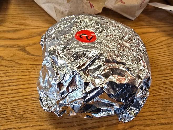 쿠킹 호일에 쌓여져 나온 햄버거. 뜨거움 주의. 쿠킹호일이 수분과 열기의 증발을 잡아주는 역할을 하기 때문에 테이크아웃 해서도 맛있게 먹을 수 있을듯하다.