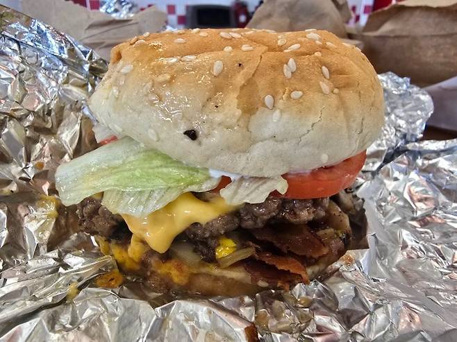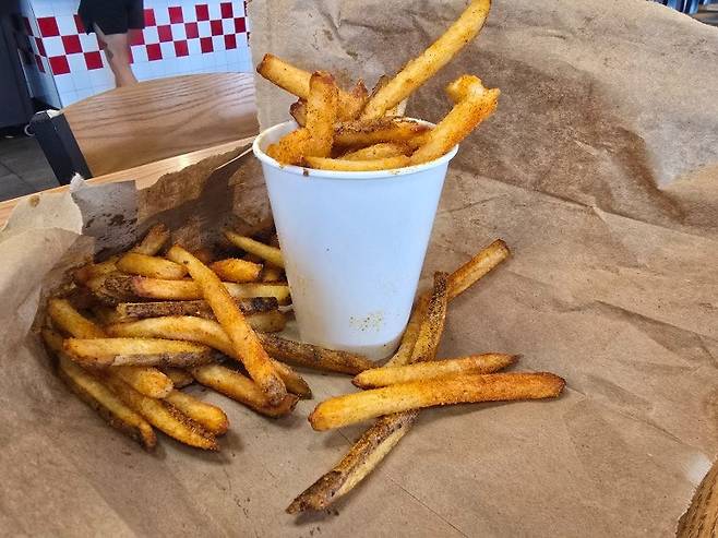 파이브 가이즈 햄버거를 먹을때는 고상하게 먹는것은 애초에 포기해야 한다. 햄버거 빵은 고소했고, 소고기 풍미가 가득한 패티에 녹아든 치즈의 고소함에 신선한 야채와 절묘한 소스배합까지 모든 재료들이 완벽한 조화를 이루어 풍성한 맛을 보여줬다.