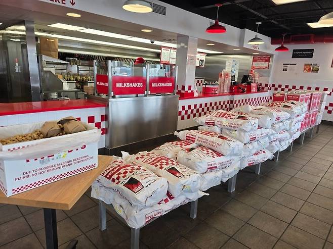 마음껏 퍼먹을 수 있는 땅콩, 감자포대, 땅콩기름은 이런 파이브 가이즈의 원칙을 보란듯이 전시해놓은 작품인듯 보여진다.