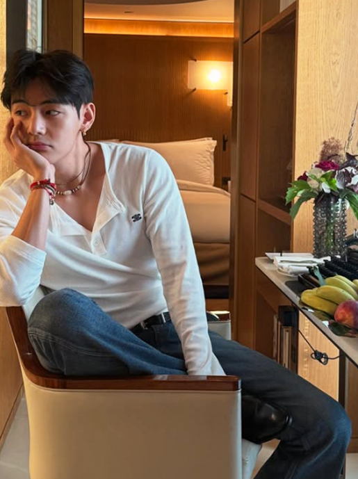 뷔, 캐주얼부터 시크까지…호텔룸 속 감각적 스타일링 눈길