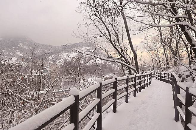 겨울에는 나뭇잎이 모두 떨어져 숲의 윤곽이 또렷해지고, 멀리 의상봉과 비계산 능선까지 시야가 트입니다. 특히 이른 아침에는 운해가 낮게 깔려, 다리 위에 서 있는 것만으로도 풍경이 완성됩니다.