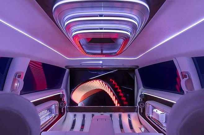 비전 V의 하이라이트는 압도적인 실내 구성이다. 독립형 프라이버시 글라스가 앞좌석과 뒷좌석을 분리하며, 전동 조절식 시트는 각도와 방향까지 사용자의 입맛에 맞게 설정할 수 있다. 여기에 벤츠가 강조한 오감 자극 요소 중 하나인 전용 향기 디퓨저, 좌석별 사운드 피드백 시스템이 더해지며 감각 중심의 경험을 극대화한다. 거대한 디스플레이로 영화나 게임을 즐길 수 있는 환경은 기존 프리미엄 밴과는 격이 다르다.