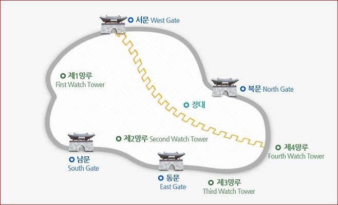 가장 많이 찾는 인기 루트로, 북문 인근에는 산성마을이 자리 잡고 있어 막걸리와 음식점을 함께 즐길 수 있습니다.