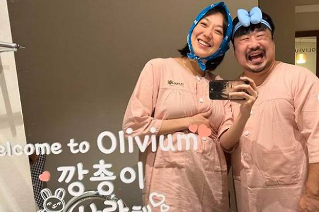 공개된 사진에서는 산모복을 입은 이은형과 강재준이 조리원 거울 앞에 나란히 서서 인증샷을 남긴 모습이 담겼습니다.