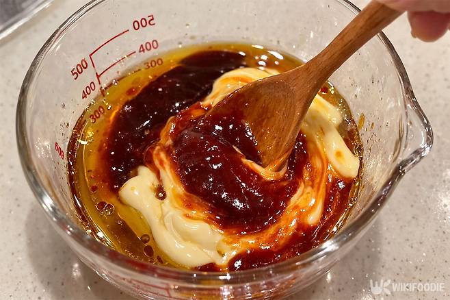 4. 그릇에 들기름, 참 소스, 불닭 소스, 마요네즈를 넣어 골고루 섞는다.