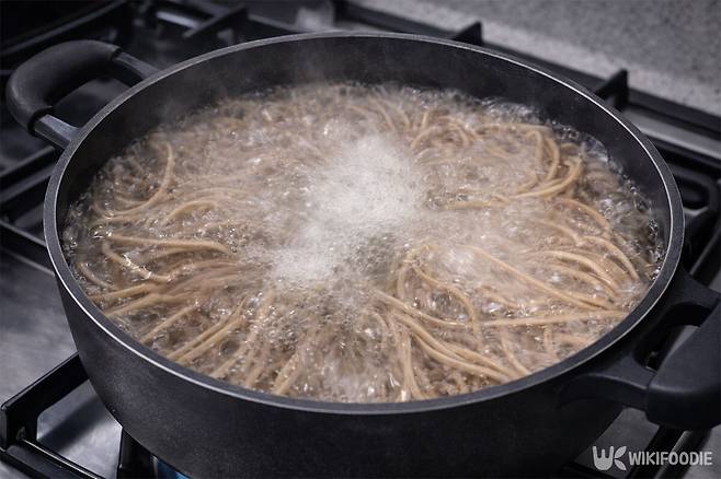 메밀국수는 삶는 과정이 맛을 결정한다. 끓는 물에 면을 넣고 약 4분 정도 삶는다. 이때 물이 거품을 내며 끓어오를 때마다 찬물을 조금씩 붓는 과정을 세 번 반복한다.