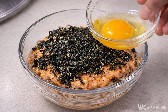 메밀국수 1인분, 들기름 4큰술, 참 소스 2큰술, 불닭 소스 1큰술, 마요네즈 1큰술, 계란 노른자 1개, 김자반 넉넉히