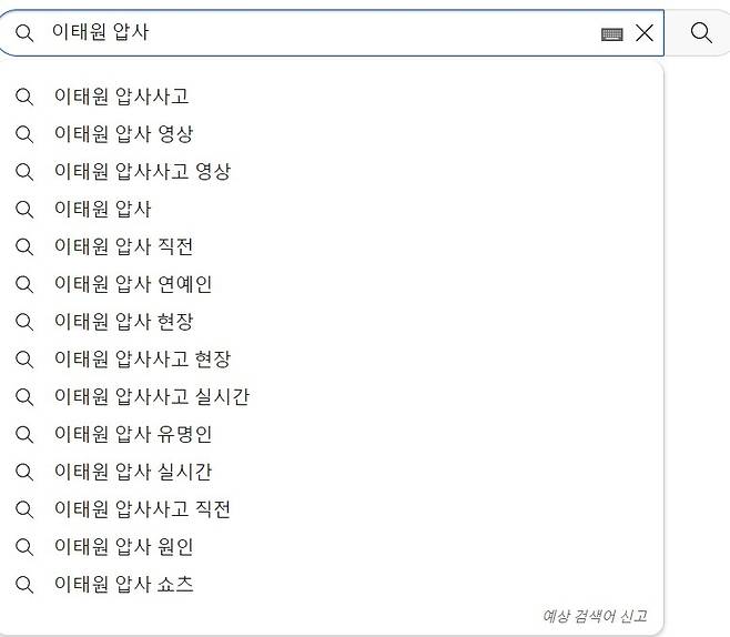채널 검색 화면에서 '이태원'만 쳐도, '압사 사고', '압사 영상', '라이브', '심정지', '유명인', '사망' 등 연관 검색어가 자동으로 완성됐다. 인스타그램 역시 '이태원 압사 사고' 해시태그로 524건의 게시물이 올라왔다.