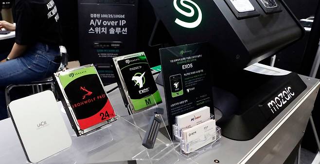 엔터프라이즈급 하드인 EXOS를 시작으로 씨게이트의 대표적인 NAS스토리지인 아이언울프시리즈까지 모두 전시가 되었습니다. 구축하고자 하는 솔루션에 따라서 유연하게 대응할 수 있도록 속도 용량 안정성 호환성을 다양한 제품별로 세분화했기 때문에 중소형의 서버가 아니더라도 개인용 2bay NAS 구성에서도 장점을 보이고 있습니다.