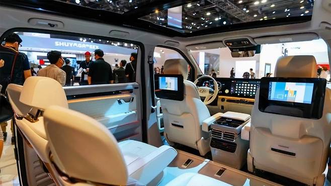 실내 경험을 완성하는 요소는 SDV(Software Defined Vehicle) 기반의 디지털 기능입니다. 대형 디스플레이와 인터컴, 대화형 AI 비서가 적용되어 차량 내 소통 방식을 혁신합니다. 스마트 데스크 모드는 이동식 업무 환경을, V2L 기능은 외부 전자기기 사용을 가능하게 합니다. 하드웨어보다 소프트웨어가 공간의 쓰임을 결정하는 미래 지향적인 구조입니다.