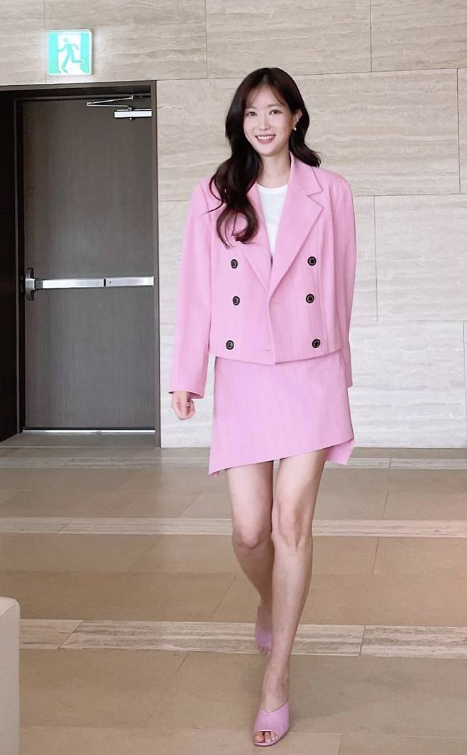 임수향은 머리부터 발끝까지 핑크로 물들인 핑크셋업으로 로맨틱룩을 연출하였습니다.