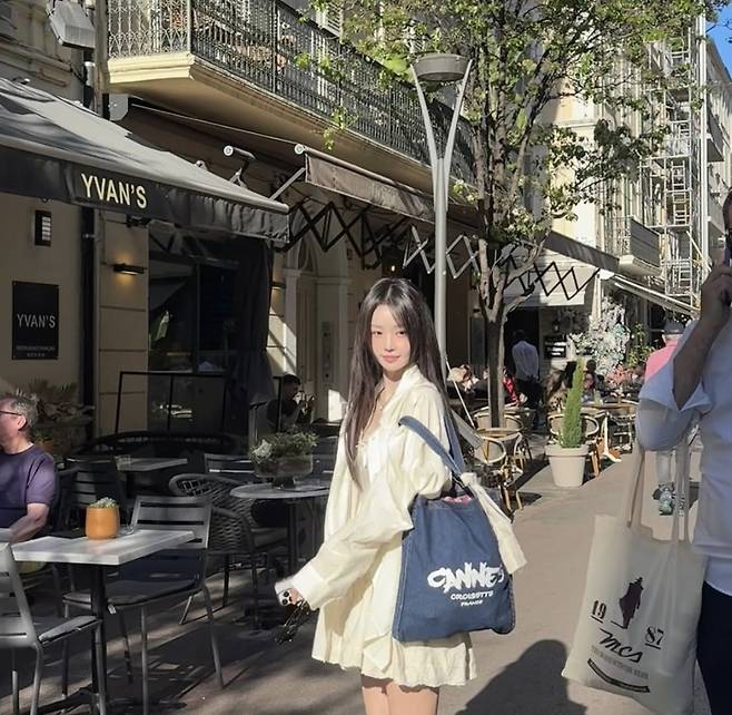 남규리는 크림빛 미니 원피스 위에 내추럴하게 걸친 루즈한 셔츠, 여기에 짙은 네이비 컬러의 토트백을 매치해 프렌치 감성에 꾸안꾸 매력을 더했습니다.
