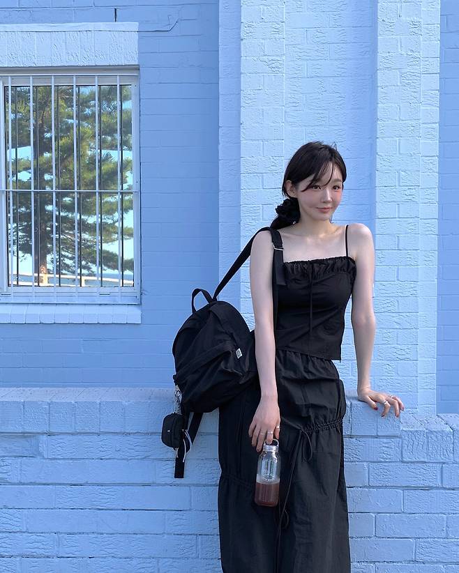 포인트는 블랙 헤어 슈슈와 맑은 네일 컬러, 그리고 손에 들린 유리병 음료까지.
